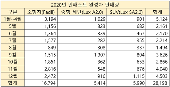 사실 빈패스트의 판매량을 보려면 세단, SUV 2 차종 판매량을 살펴보아야 합니다. 세단, SUV는 빈패스트가 글로벌 소싱, 오스트리아 업체 마그나(Magna)와 협력하여 자신들이 주도적으로 만든 최초의 차량입니다. 반면, 파딜(Fadil)은 본래 글로벌 완성차 업체 GM의 스파크 차량인데 GM으로부터 부품을 전부 공급받아 조립, 마크만 바꿔 팔고 있기 때문입니다. 아래 표를 보시면 소형차 파딜의 점유율은 약 60%로 이를 제외하면 판매량 순위는 10위로 하락합니다.